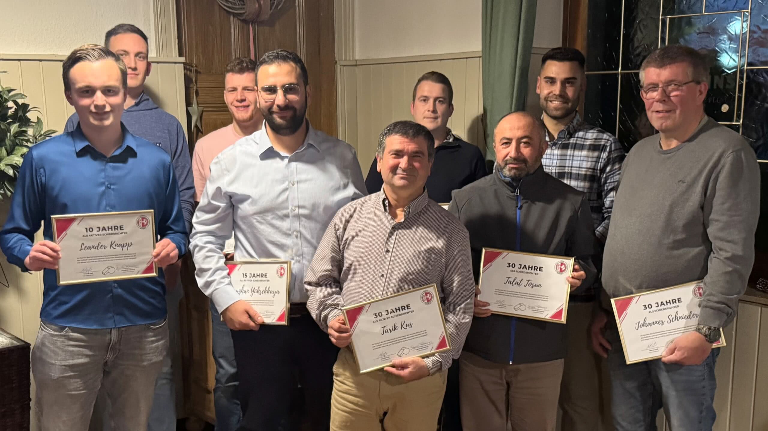Traditionell stand bei den Schiedsrichtern des FLVW-Kreises Soest nach dem letzten Schulungsabend des Kalenderjahres die gemeinsame Weihnachtsfeier auf dem Programm. In der Gaststätte Hagen in Westönnen kamen mehr als 70 Unparteiische zusammen, um auf die vergangenen Monate zurückzublicken.Nach einer kurzen Zusammenfassung der aktuellen Hallenregeln leitete Jürgen Gosmann mit einem musikalischen Beitrag auf seiner Trompete den geselligen Teil ein. Anschließend gab es ein Grußwort und die Ehrungen: Marcel Voß als Vorsitzender des Kreis-Schiedsrichter-Ausschusses (KSA) bedankte sich mit Urkunden und Präsenten bei Dustin Decker, Leander Knapp, Darius Schneider (jeweils 10 Jahre), Oguzhan Yüksekkaya (15), Dennis Felstau (20) sowie Tarik Kus, Johannes Schnieder und Talat Tosun (jeweils 30 Jahre) für ihre langjährige Tätigkeit als Referees.