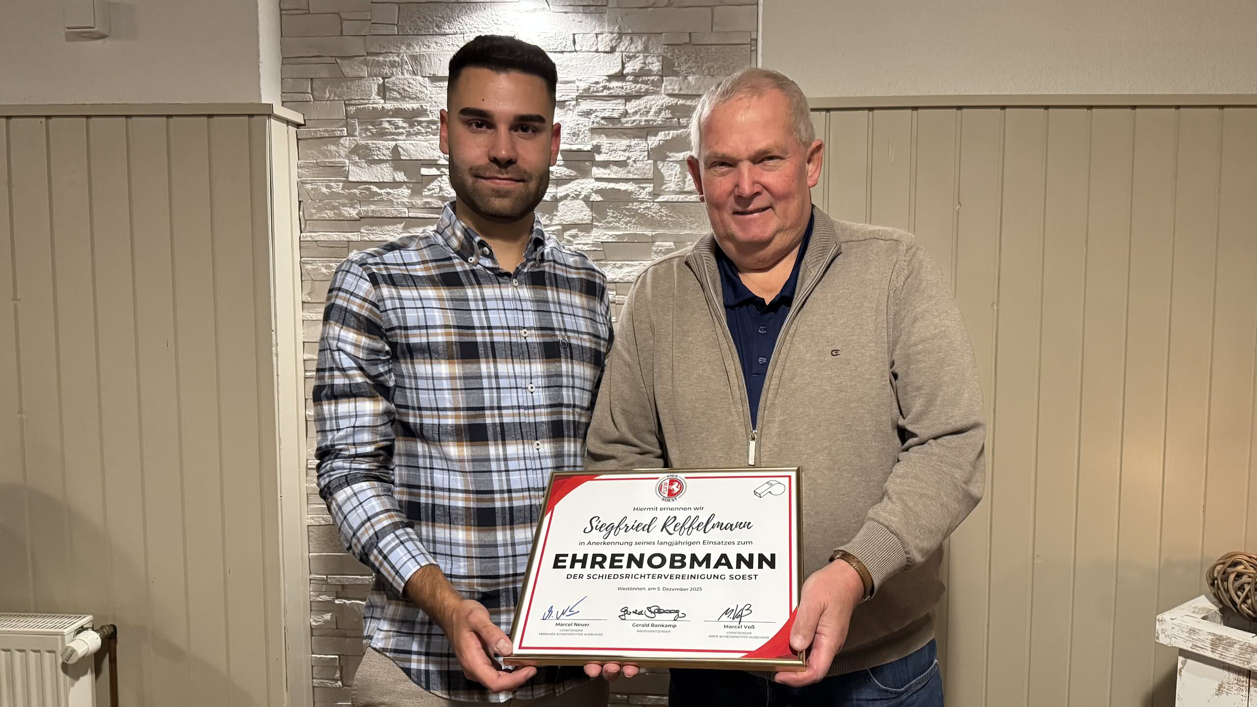 Reffelmann war sichtlich gerührt, lobte in seiner Dankesrede vor allem den neuen KSA rund um seinen Nachfolger. Als er gerade wieder Platz genommen hatte, bat Marcel Voß ihn nochmals nach vorne, um ihn ein zweites Mal zu überraschen. Denn quasi für sein Lebenswerk und die vielen Jahrzehnte im Dienst der Soester Schiri-Kameradschaft wurde Reffelmann noch als "Ehrenobmann der Schiedsrichtervereinigung" ausgezeichnet. Diese zweite, noch größere Urkunde machte den 69-Jährigen endgültig sprachlos.