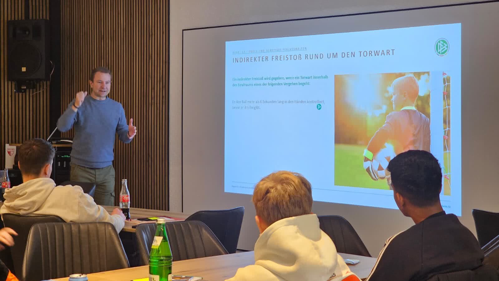 „Die Aufgabe der Lehrwarte, euch die Fußballregeln näher zu bringen, ist getan“, sagte Marcel Voß, der Vorsitzende des Schiedsrichter-Ausschusses, in Richtung der jungen Unparteiischen. „Die eigentliche Ausbildung beginnt allerdings jetzt erst, nämlich in der Praxis – mit Spielleitungen auf den Plätzen.“Bei den ersten Partien werden die Schiris an die Hand genommen. „Die Neulinge werden von erfahrenen Schiedsrichtern, unseren ausgebildeten Paten, begleitet und unterstützt“, so Voß. Das Patensystem habe sich in den vergangenen Jahren bewährt.